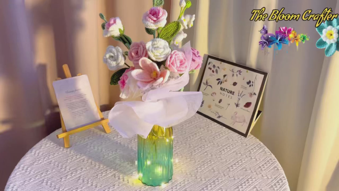 Handmade Crocheted Rose Bouquet with Lilies, Eucalyptus, Tulips, Forget-Me-Nots