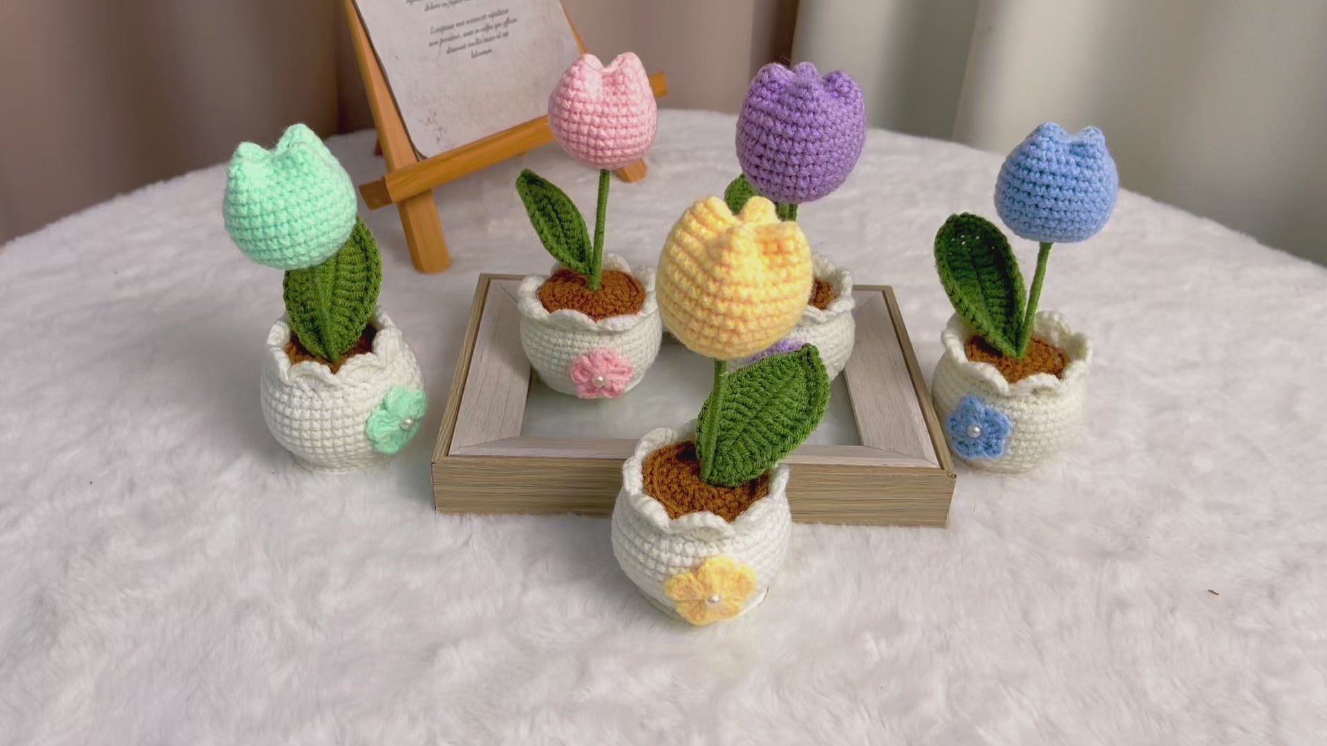 Handcrafted Crochet Tulip White Potted Plant with 5 Color Options - Pink, Purple, Yellow, Blue, Mint - Ideal for Home Decor, Birthday Anniversary Housewarming Gifts