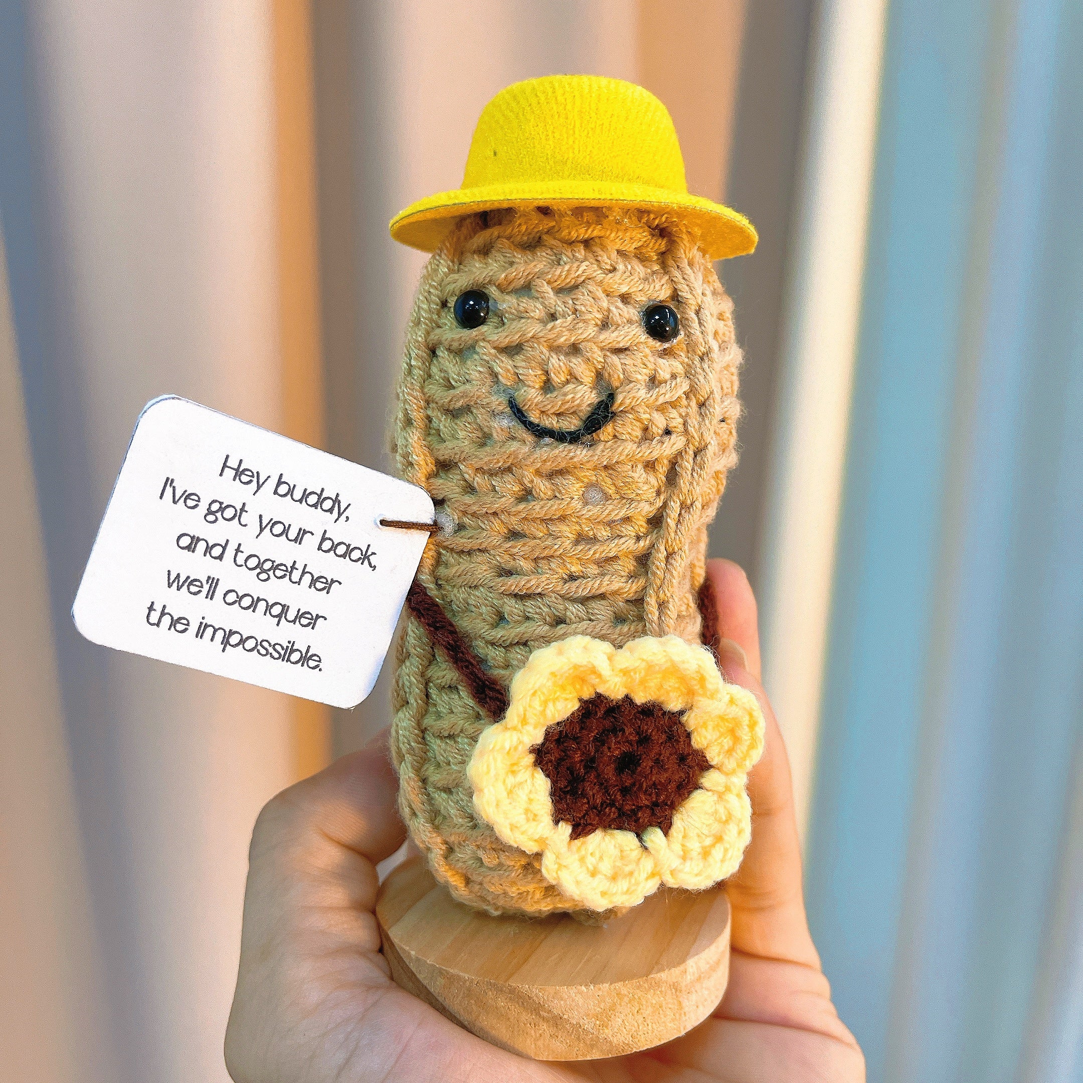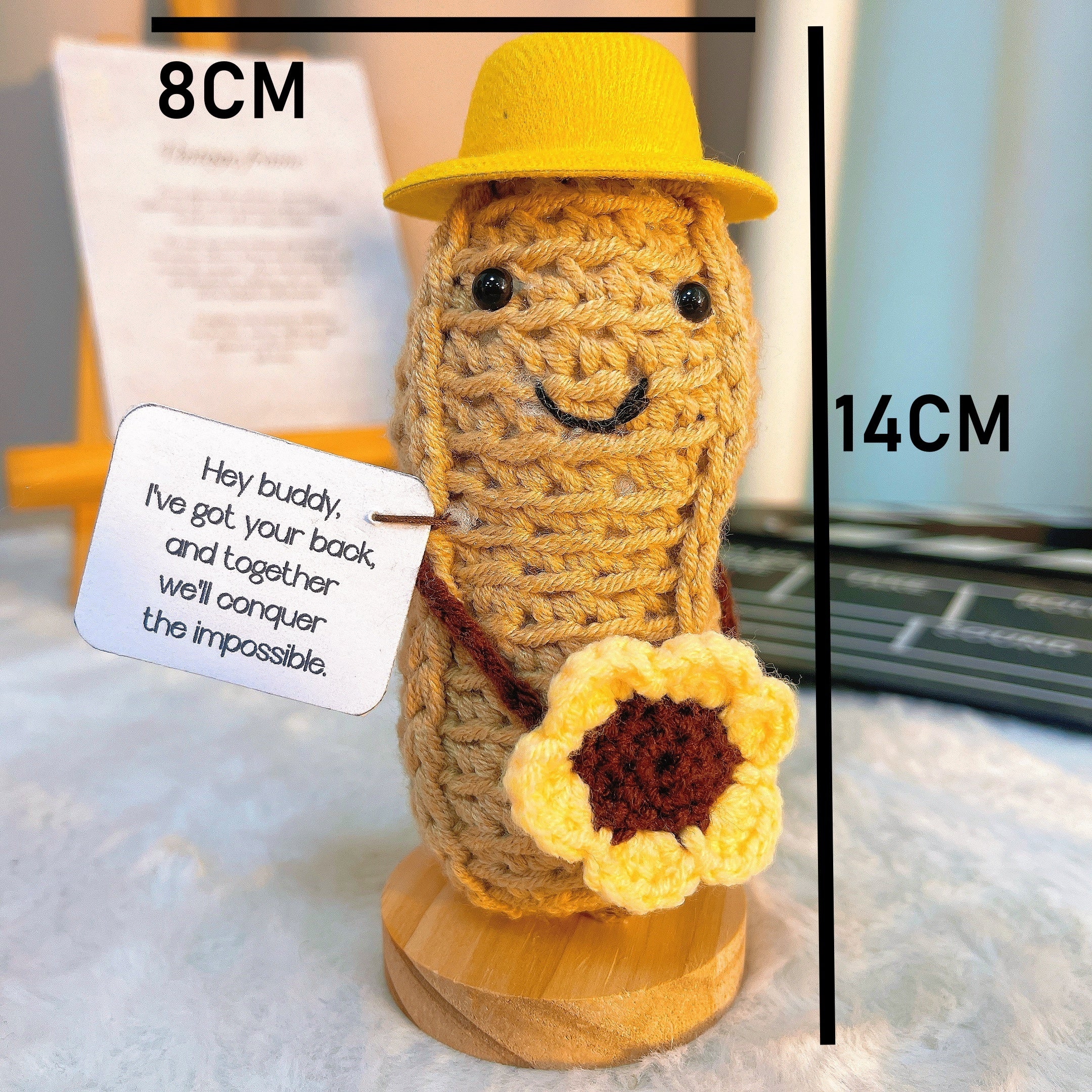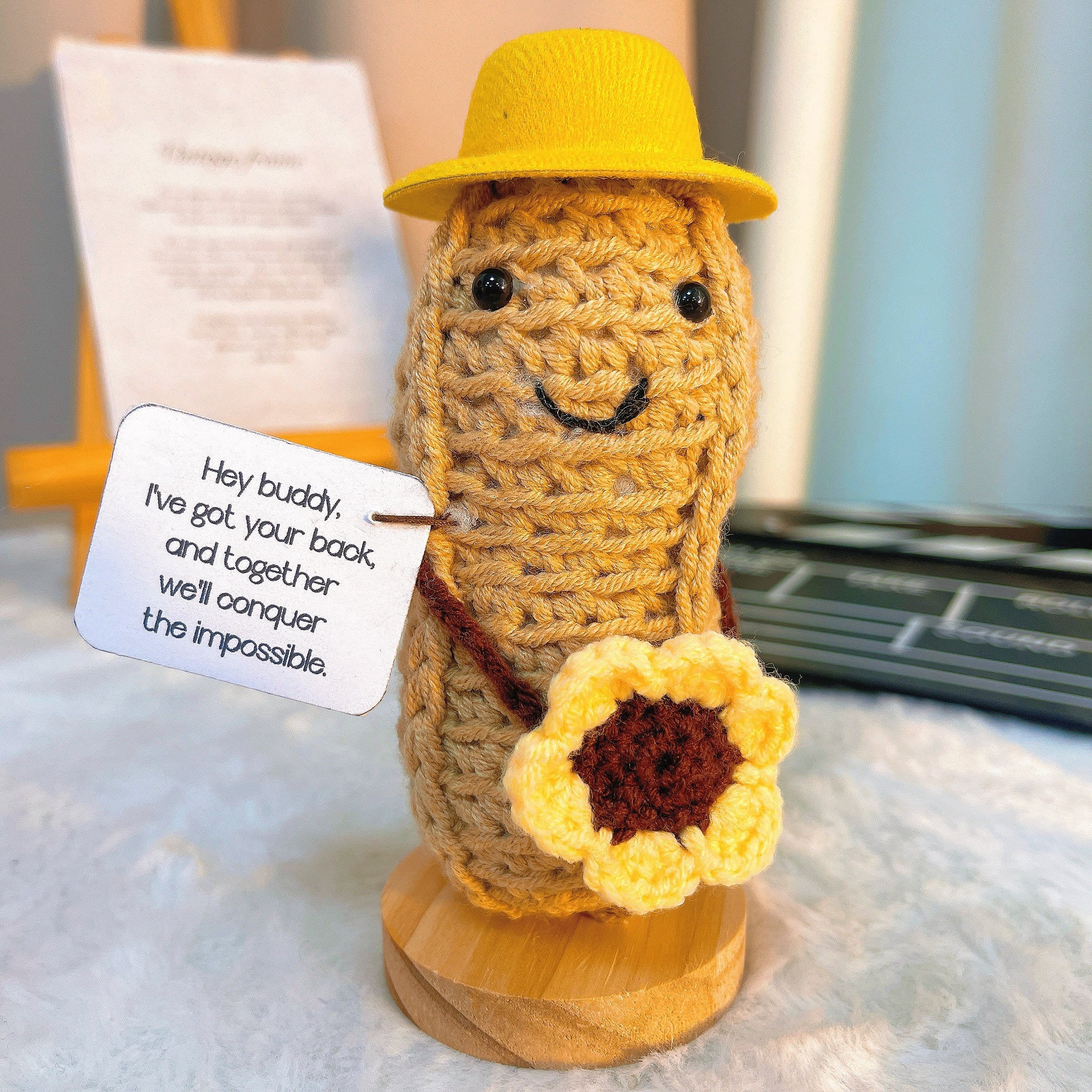Amusable Peanut Supportive Plushie with Customizable Message Card - Adorable Yellow Hat and Sunflower, Perfect Jelly Crochet Custom Gift for Friendship, Birthdays, Celebrations, and Encouragement