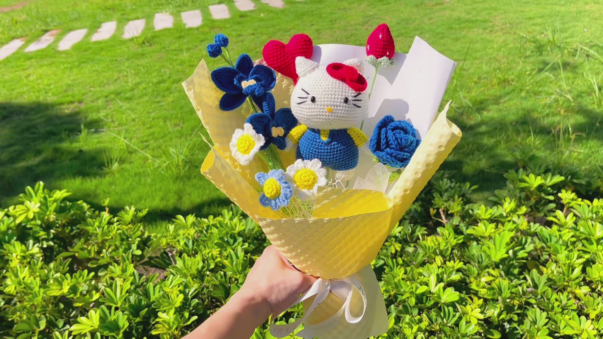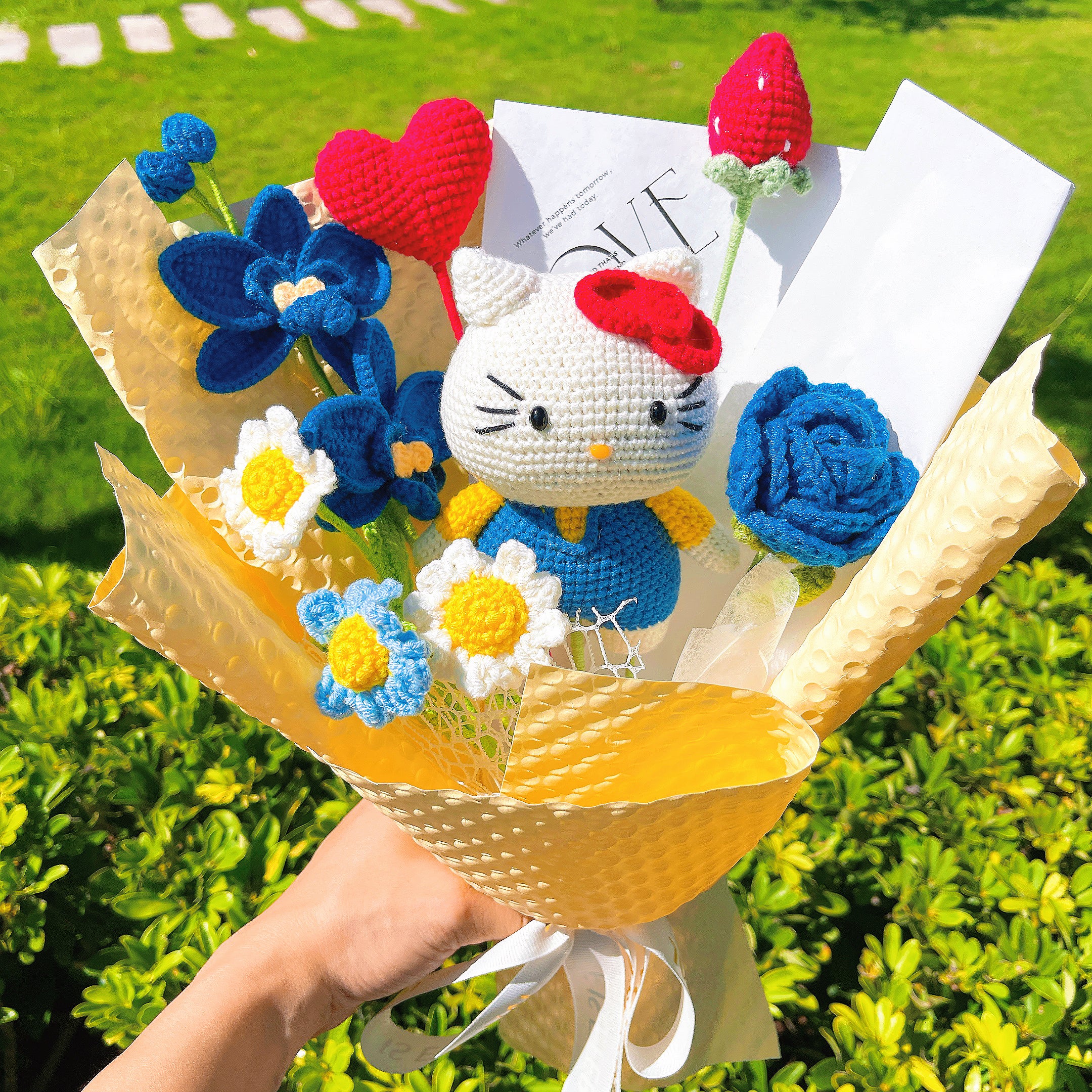 Say hello to our enchanting kitty inspired crochet flower bouquet - a delightful fusion of kawaii charm and everlasting blooms! This meticulously handcrafted arrangement features: