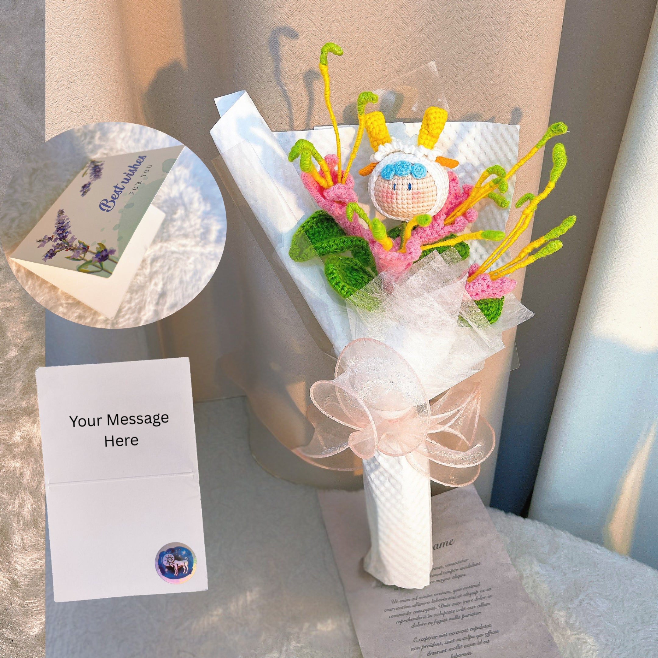 Crochet Aries Zodiac Flower Honeysuckle Bouquet - Handmade Hypoallergenic Floral Gift for Birthday, Mother’s Day, Wedding - Plush Aries Doll, White Gingham Wrapping