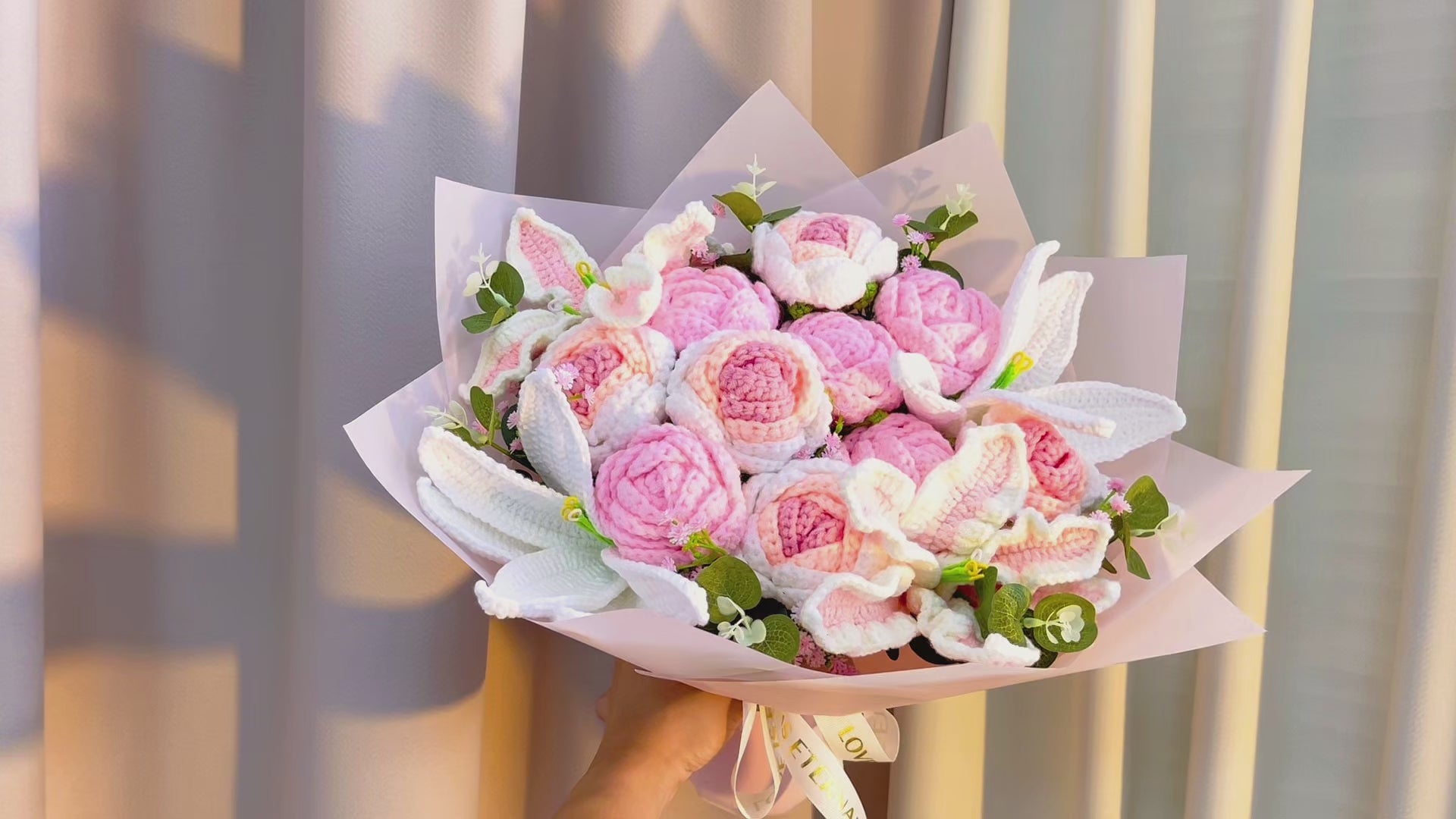 Presenting an exquisitely hand-crocheted floral bouquet, designed to capture the delicate beauty of fresh flowers without the worry of wilting or allergies. Each petal and leaf is meticulously crafted with premium yarn, creating a stunningly lifelike arrangement that will brighten any space indefinitely. Perfect for those with pollen allergies, this bouquet offers all the charm of nature with none of the drawbacks.