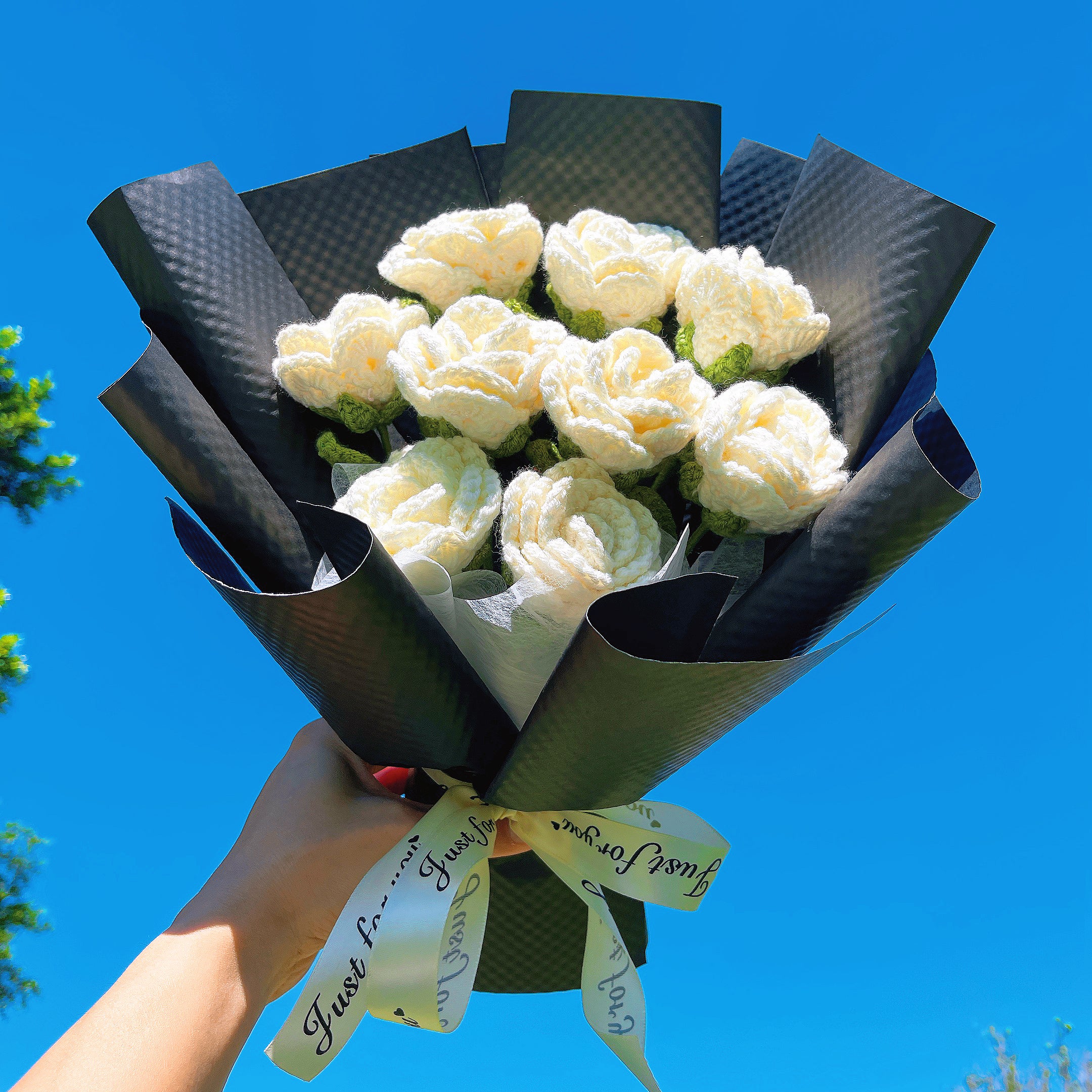 Present this dignified hand-crocheted bouquet as a lasting symbol of remembrance. Featuring nine meticulously crafted white roses nestled against sophisticated black plaid wrapping paper, this arrangement embodies reverence through its pure monochrome palette. Perfect for those seeking traditional funeral flowers with enduring beauty.