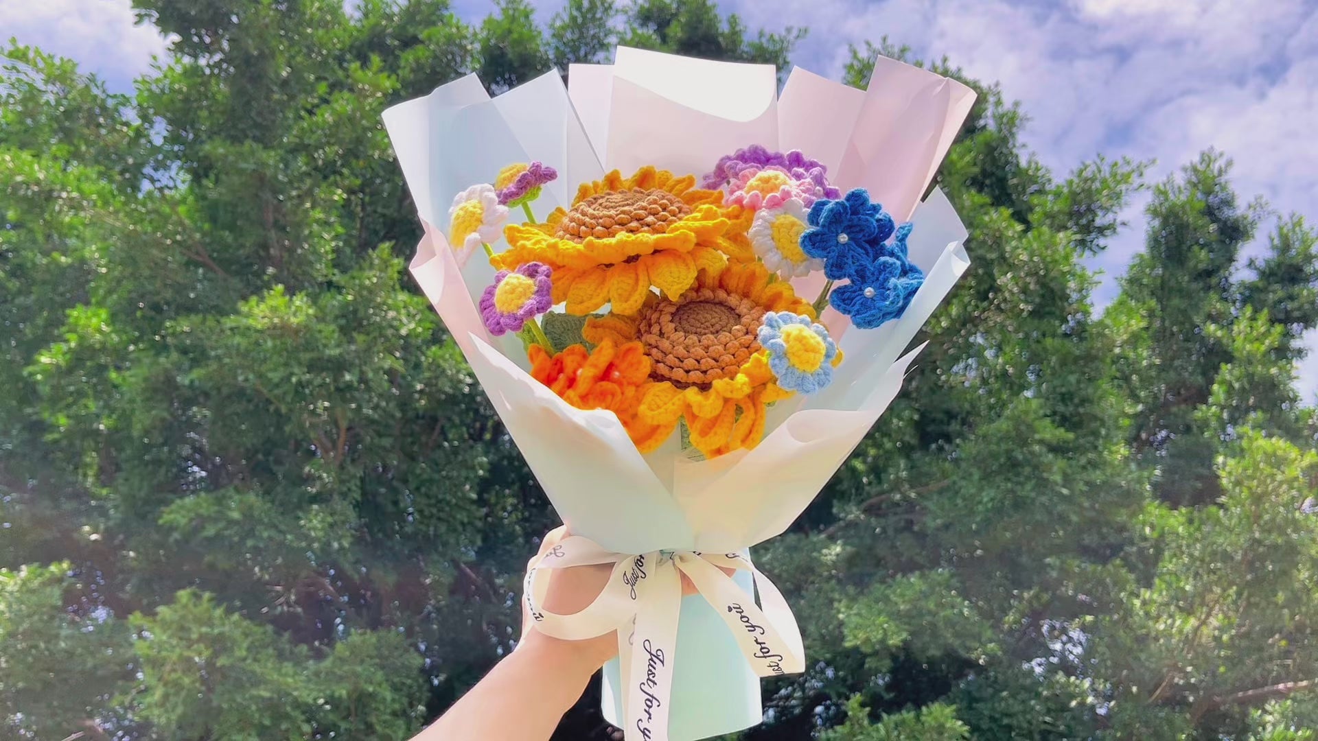 Hanaya Series Handmade Crochet Sunflower Bouquet with Multicolor Daisies & Forget-Me-Nots, Hypoallergenic Everlasting Floral, Ready-to-Gift
