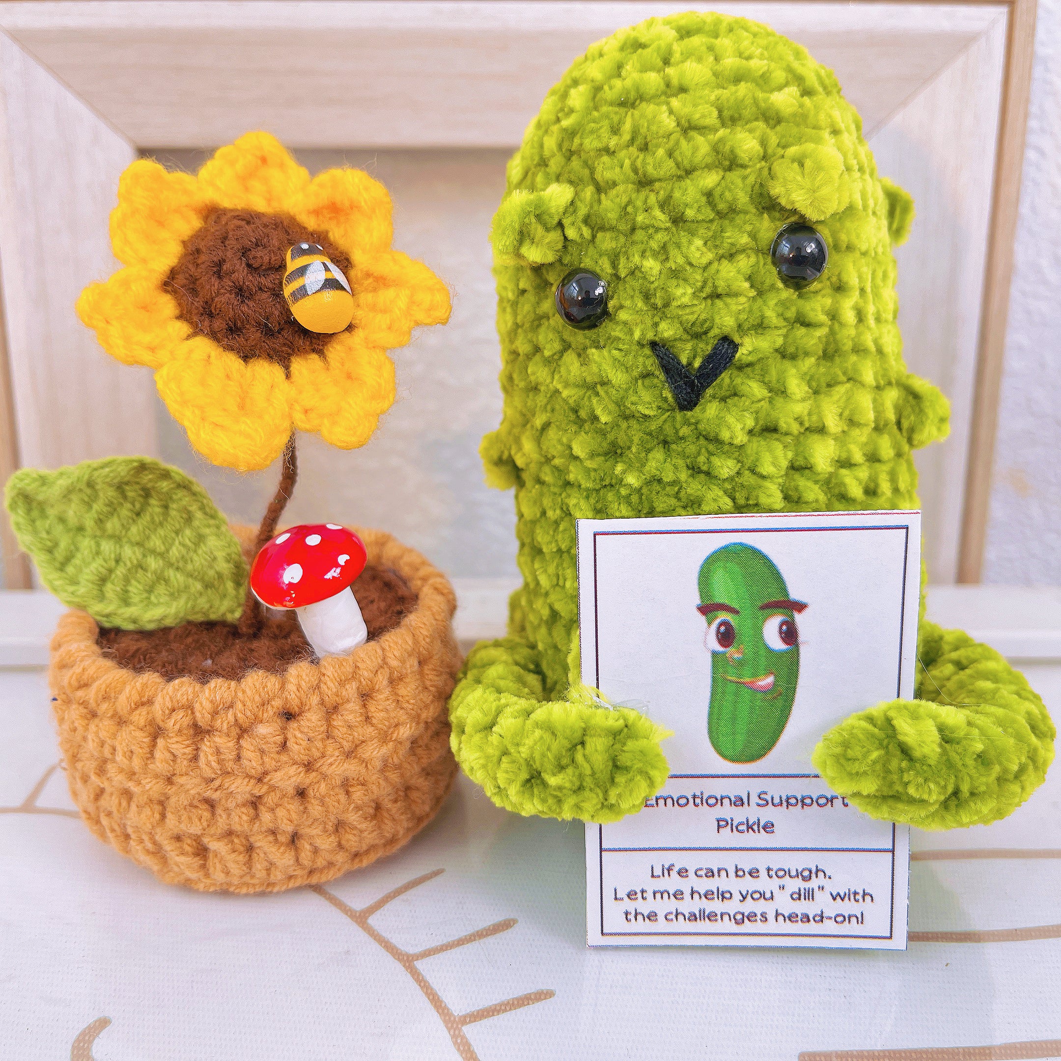 The Handcrafted Crochet Supportive Pickle is a unique and adorable creation. Lovingly crafted by skilled artisans, this pickle figurine serves as a symbol of support, encouragement, and resilience. Its whimsical design and intricate crochet detailing make it a conversation starter and a whimsical addition to any room.