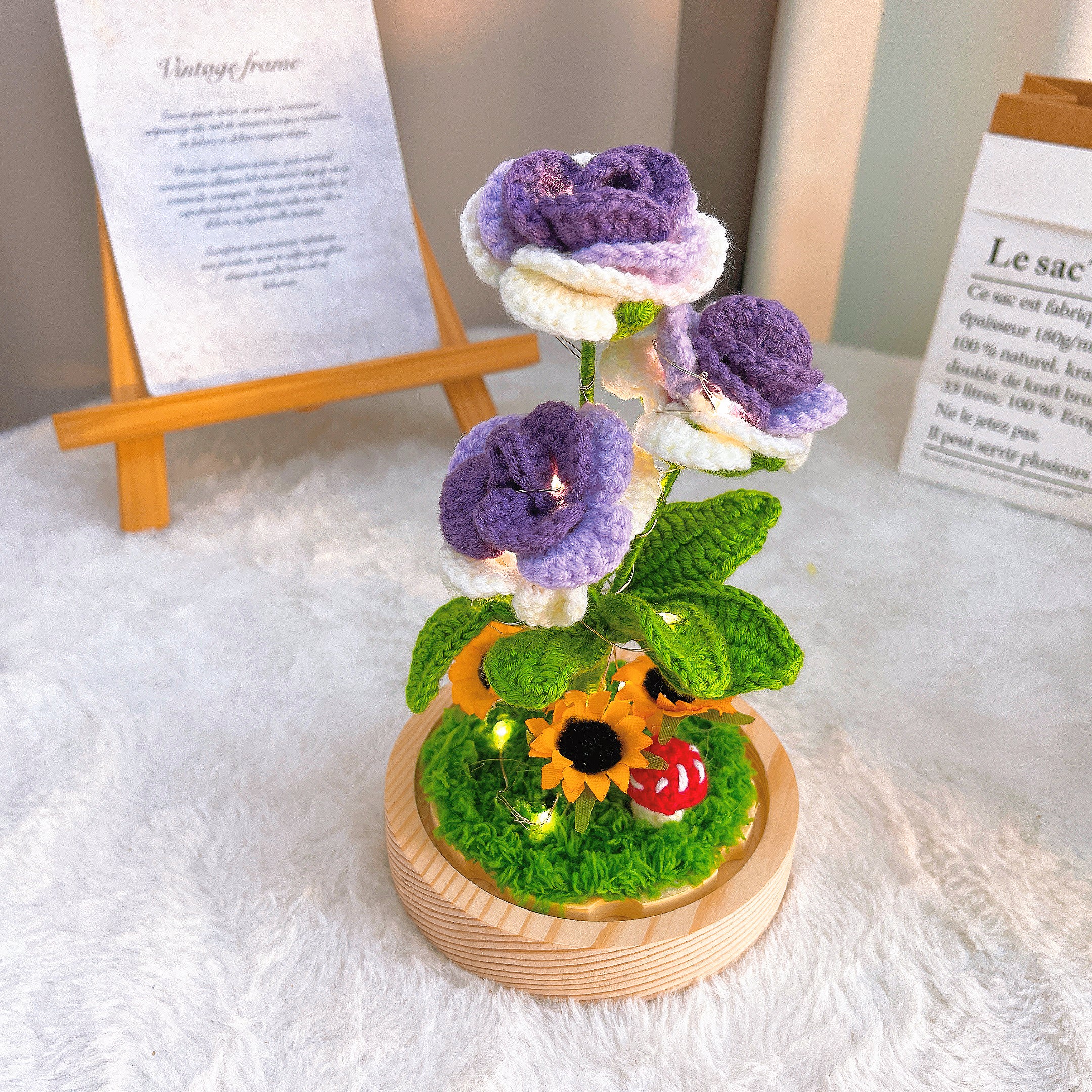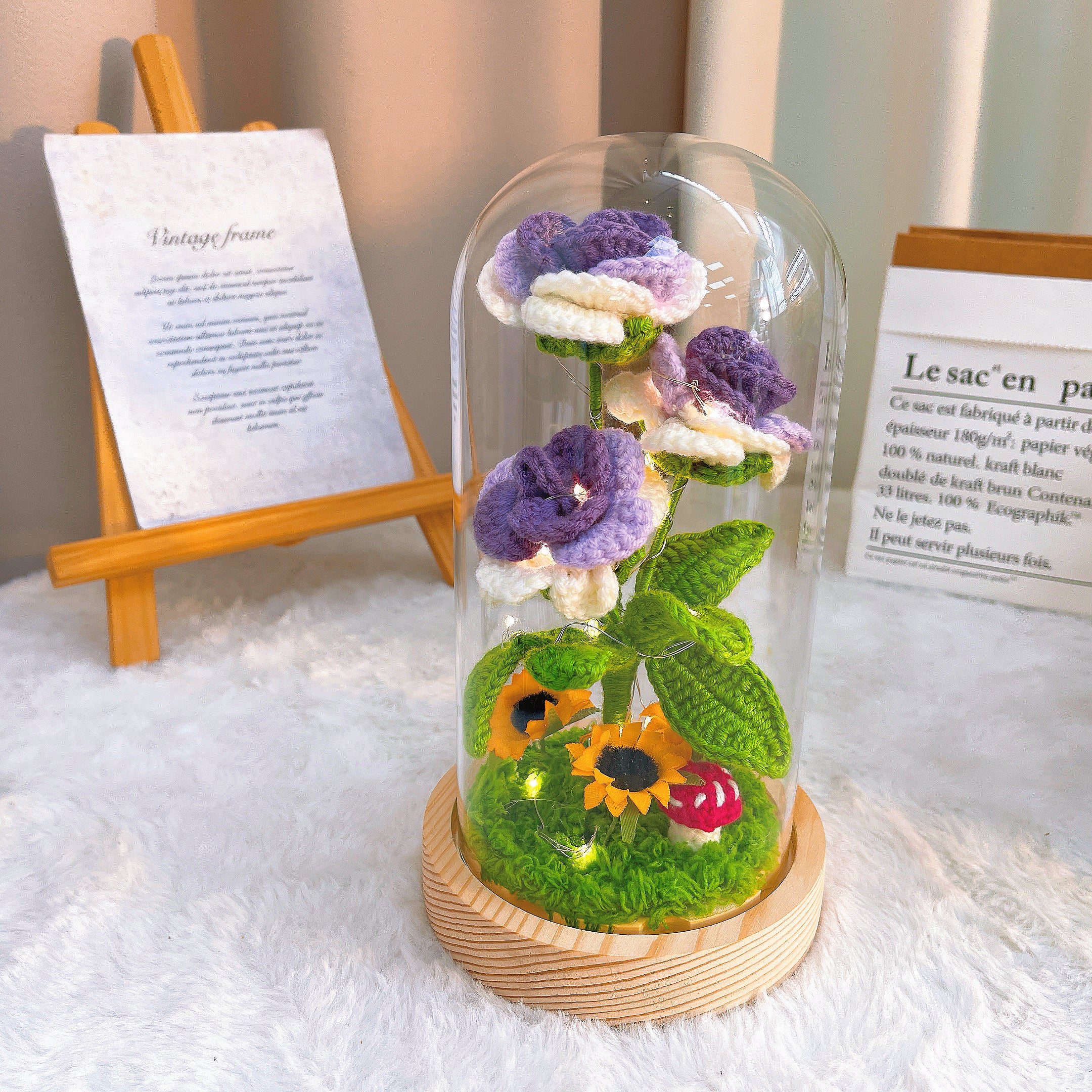 Handmade Crochet Rose Lamp - 3-Piece Customizable Pointed Roses with Wooden Base, Battery-Powered, Optional Glass Dome, Sunflower & Mushroom Accents for Desk/Bedroom Decor