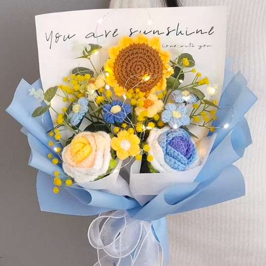 Introducing the Luminous Joy, an extraordinary handmade crocheted flower bouquet that radiates beauty, happiness, and a sense of enchantment. This captivating arrangement is a harmonious blend of symbolic flowers, meticulously crafted to create a truly remarkable piece of art.