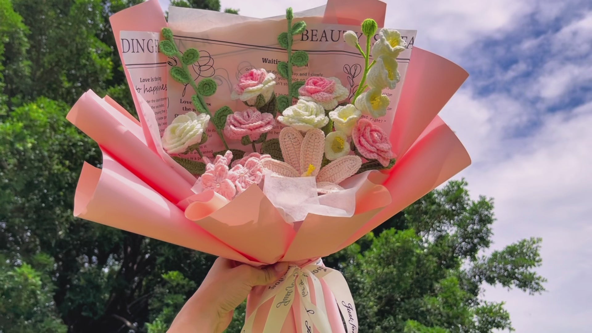 This particular bouquet contains a selection of handmade roses, lilies, eucalyptus, tulips, and forget-me-nots. Each flower is individually crocheted with intricate detailing to capture their natural beauty. The flowers are arranged to create a stunning visual impact, making this bouquet a true work of art.