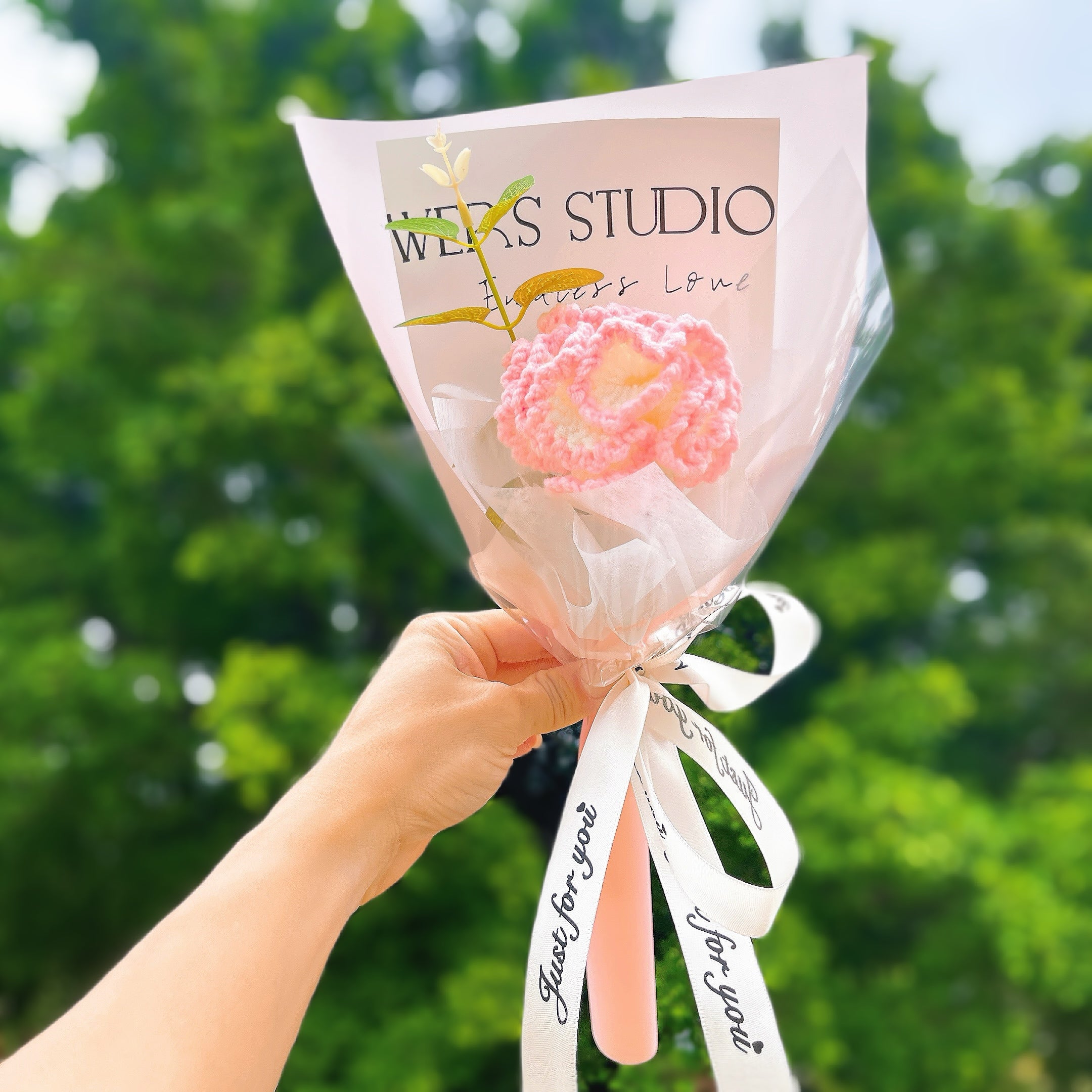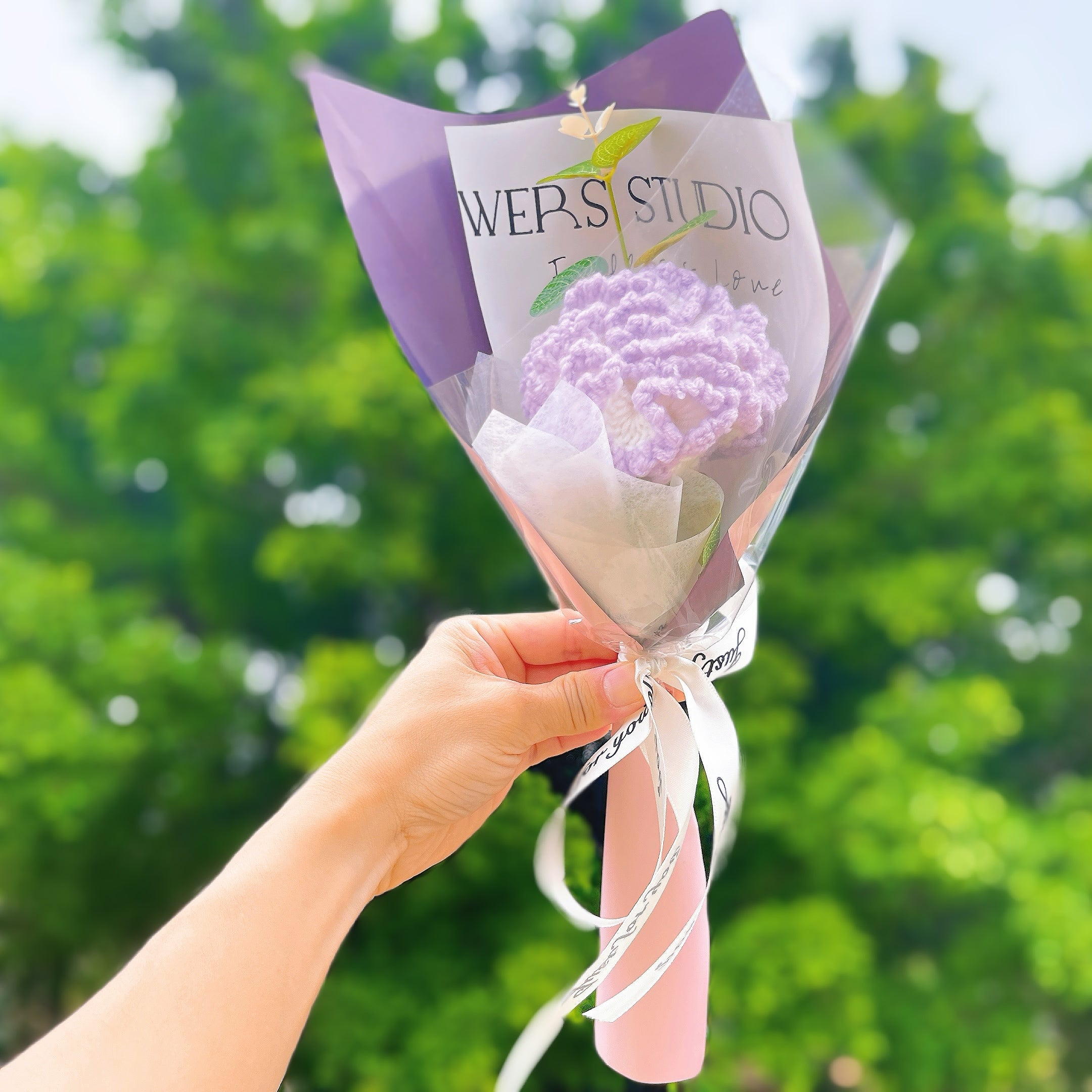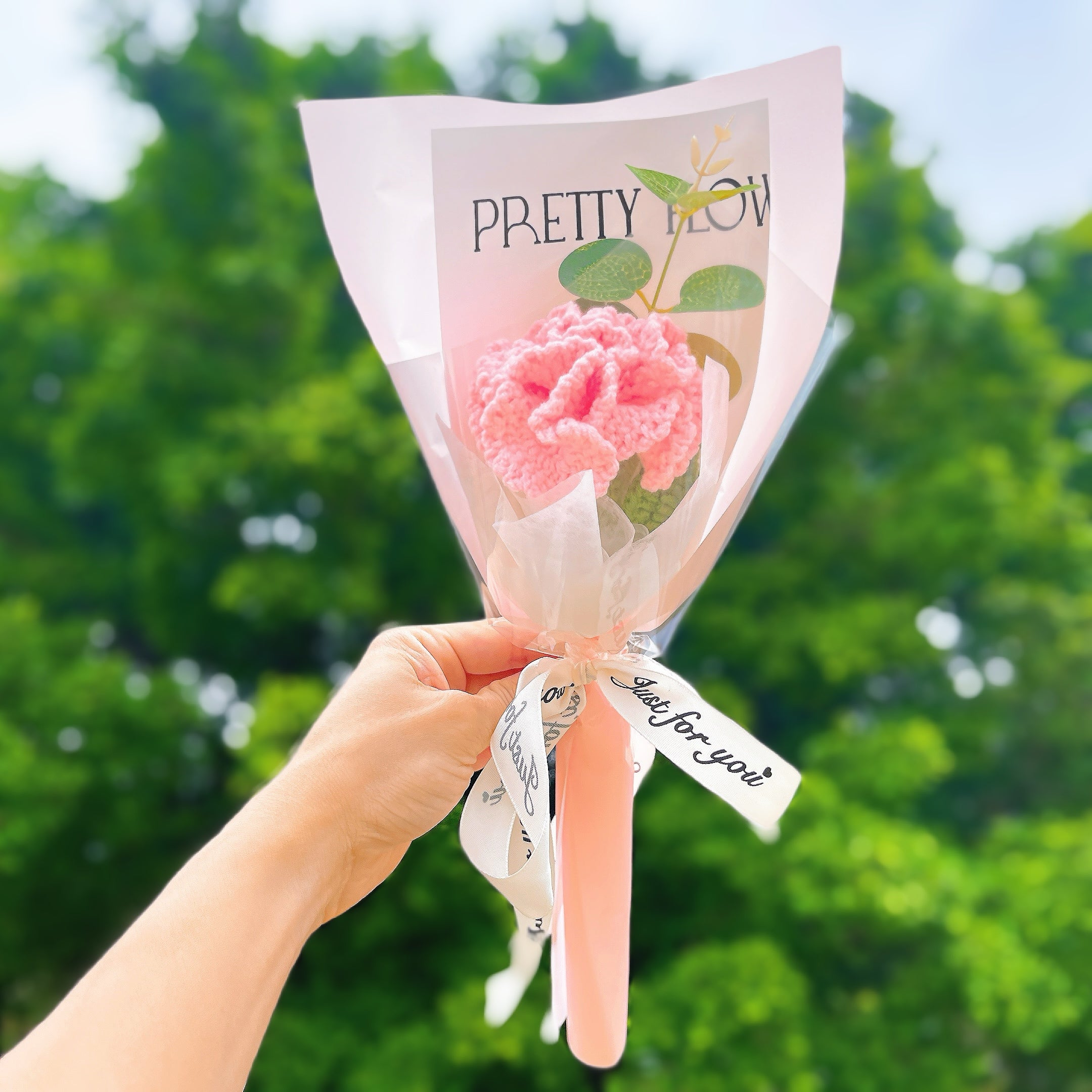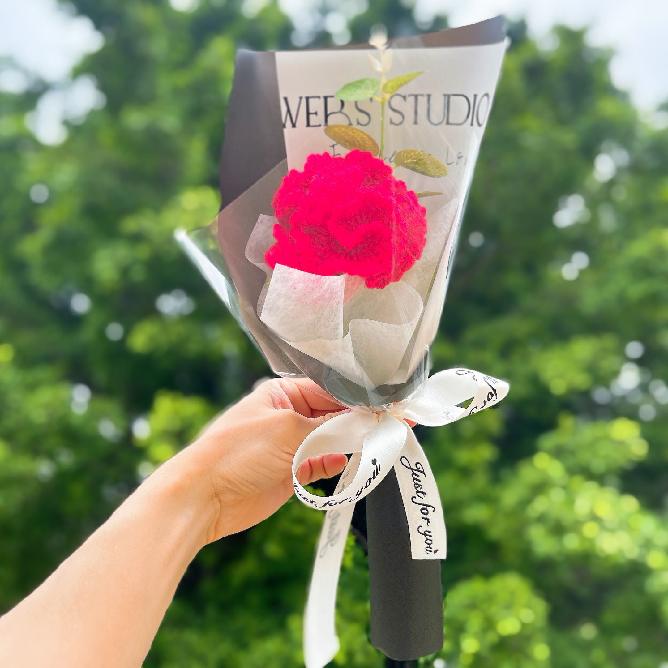 Celebrate the beauty and uniqueness of January birthdays with our stunning hand-crocheted single stem bouquet. This exquisite arrangement features eight vibrant shades of carnations, including pink, white-pink, red, white-red, purple, white-purple, yellow, and white-yellow.
