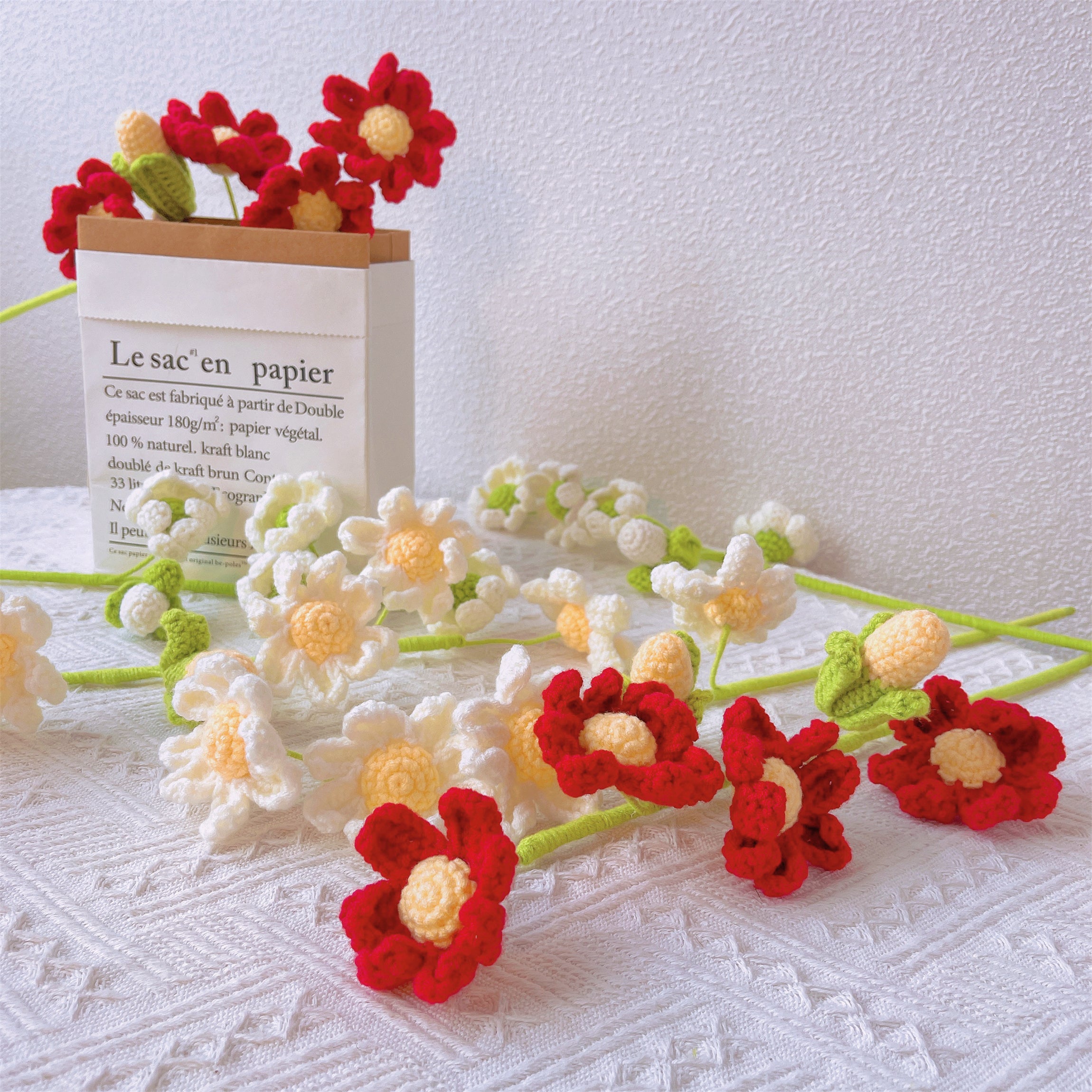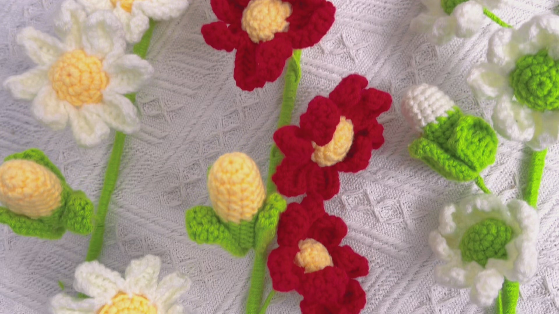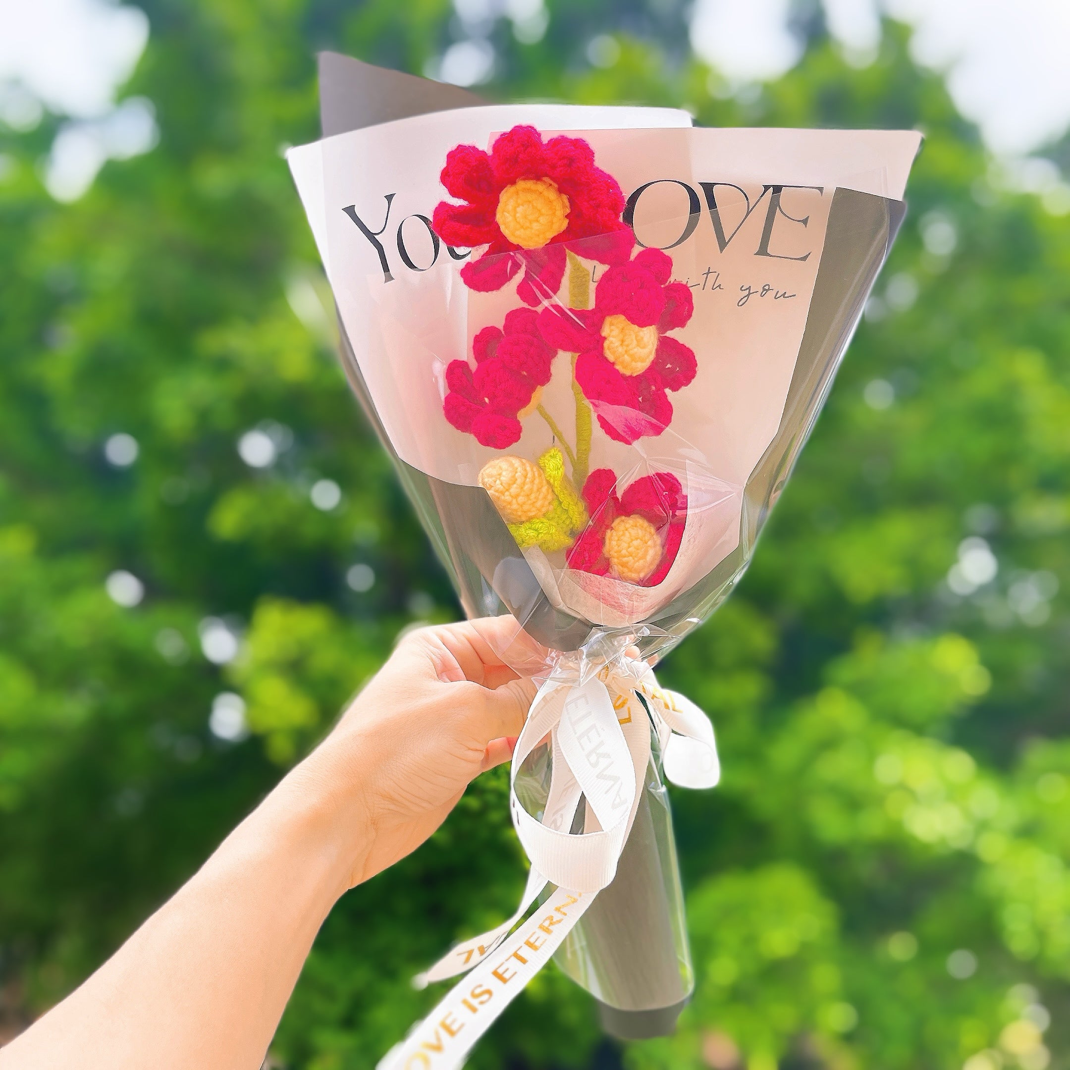 Treat someone special to a hand-crocheted Chrysanthemum (mum) bouquet this November! Our single-stem bouquets are available in three vibrant color combinations - red and yellow, white and green, and white and yellow - to perfectly complement any November birthday celebration.