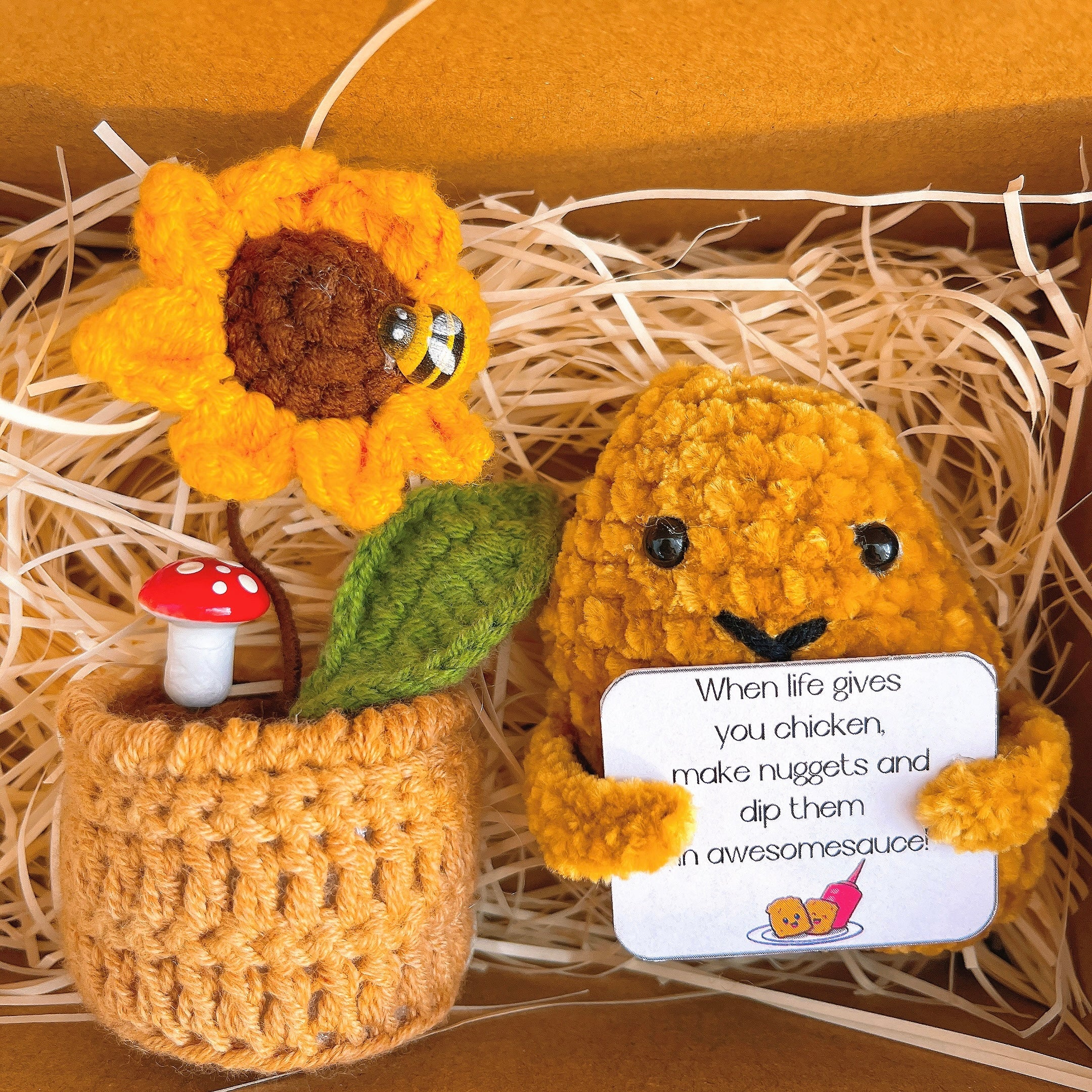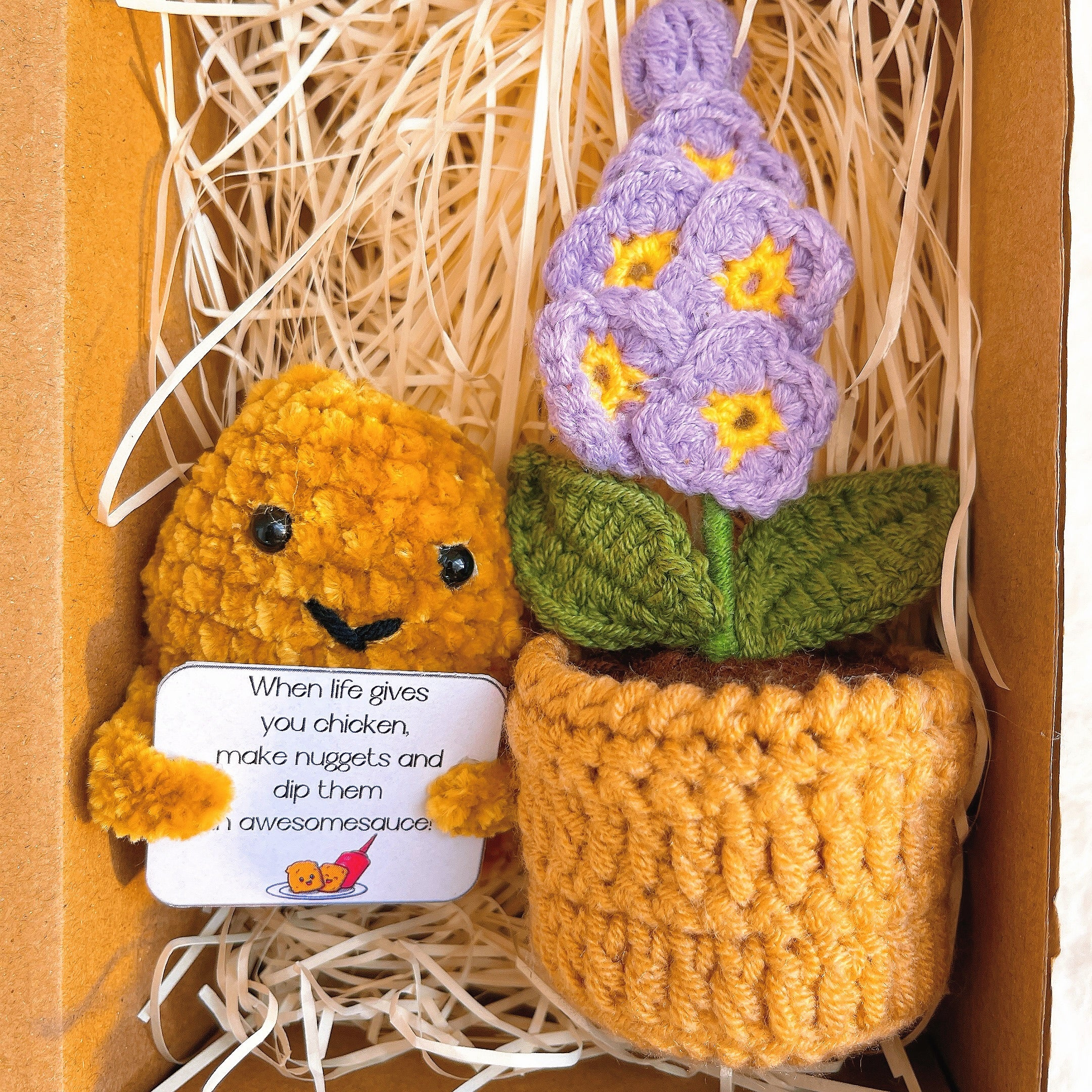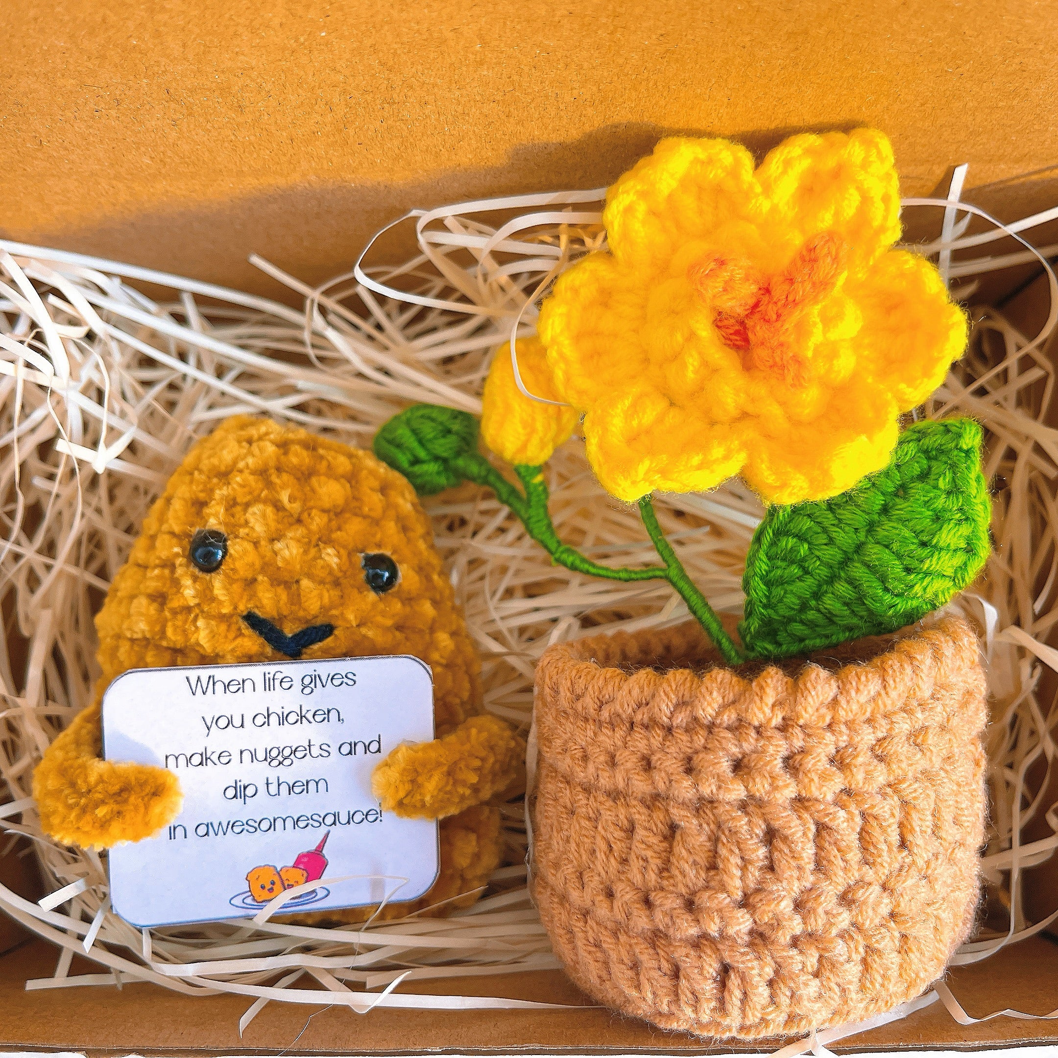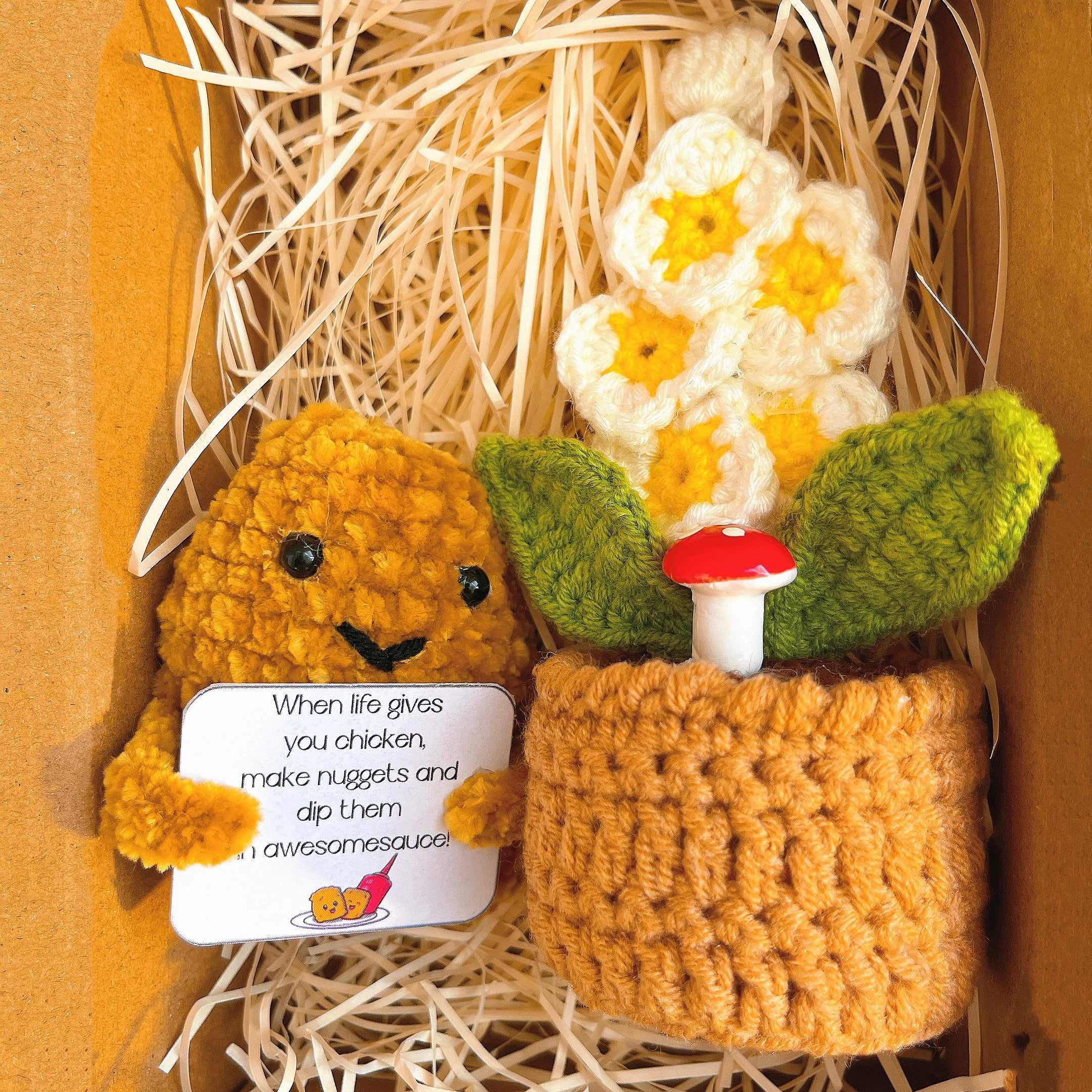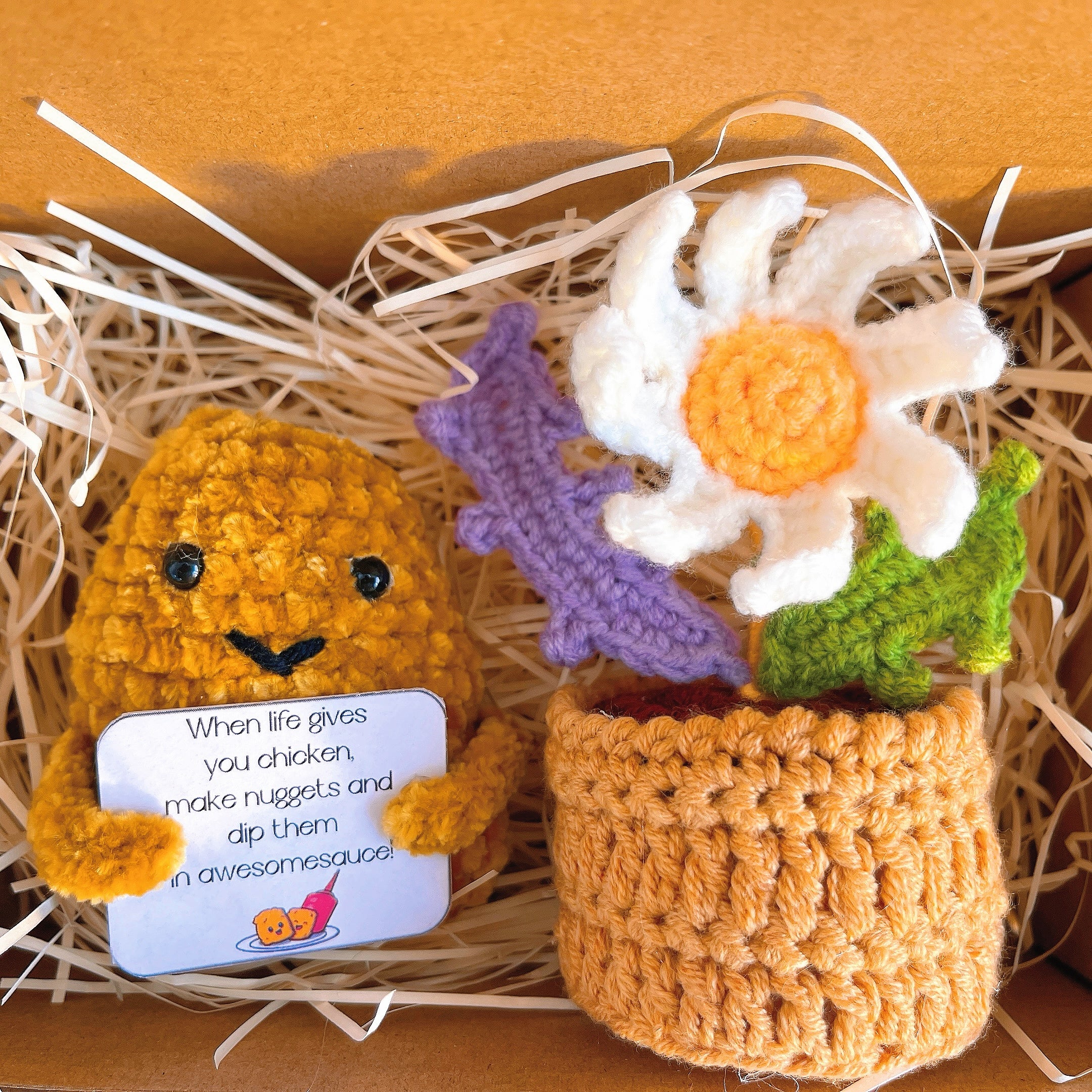 Introducing our Crochet Nugget and Mini Plant Pot Bundle with a delightful positive quote: "When life gives you chicken, make nuggets and dip them into awesomesauce!" This unique bundle is designed to inspire and uplift, making it the perfect gift to kickstart the New Year with a positive mindset.